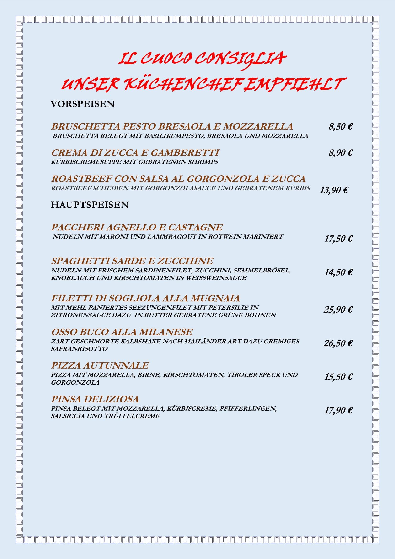 Überzeugen Sie sich auf unserer Speisekarte von der großen und interessanten Vielfalt unserer Küche! Köstlichkeiten aus dem Land im Süden Europas werden in den gemütlichen Räumlichkeiten in Ravensburg auf traditionelle Art und Weise zubereitet und serviert – hierzu gehören auch Fischspezialitäten und hausgemachte Nudelvariationen nach original italienischen Rezepten.